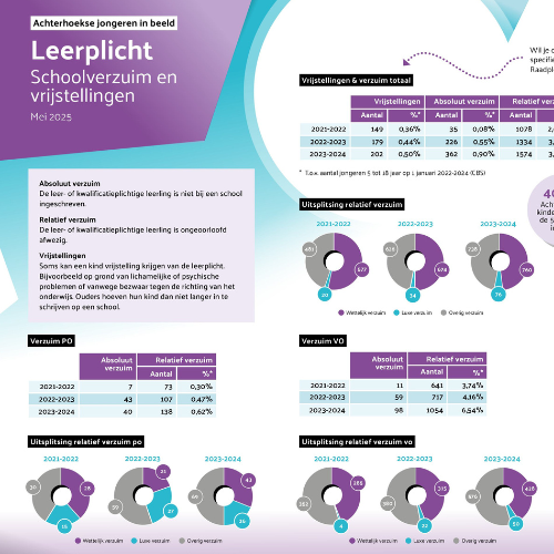 Hoe staan jongeren in de Achterhoek ervoor als het gaat om schoolverzuim, vrijstellingen en voortijdig schoolverlaten? In onze nieuwe factsheet zetten we de belangrijkste cijfers uit schooljaar 2023–2024 overzichtelijk op een rij. Je vindt er o.a. uitsplitsingen per onderwijsniveau (po, vo en mbo) en cijfers over vrijstellingen, absoluut en relatief verzuim en nieuwe vsv’ers.